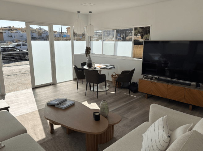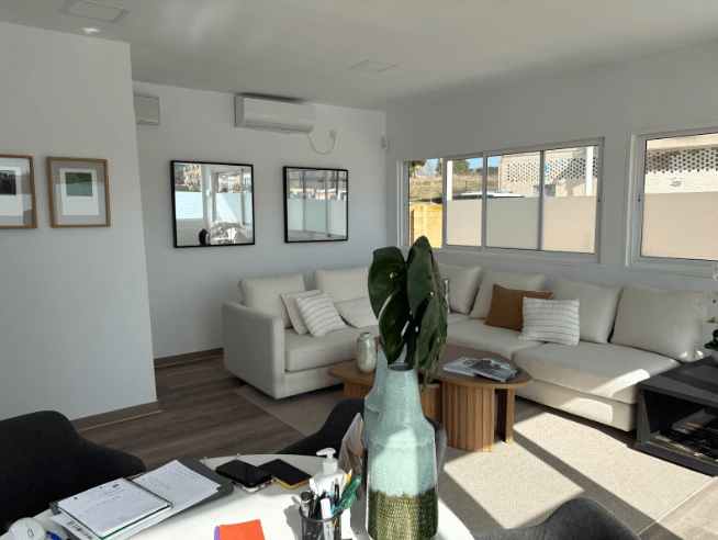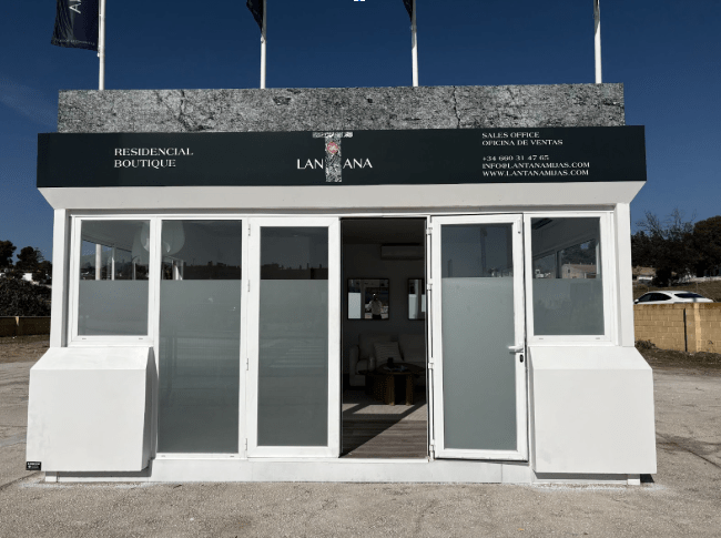La oficina prefabricada instalada en Mijas cumple una función clave: Ser el centro neurálgico de ventas de Lantana, un exclusivo proyecto residencial compuesto por 58 apartamentos de 1 y 2 dormitorios, dotado de amenidades de alto valor añadido como Sky Pool, solárium, gimnasio, sauna, espacio de co-working y sala de pilates.