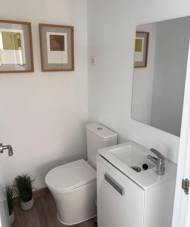- Acabados interiores de alta calidad, con trasdosados de pladur y suelos revestidos en tarima flotante de madera natural, que generan una atmósfera cálida, profesional y acogedora para los futuros compradores.